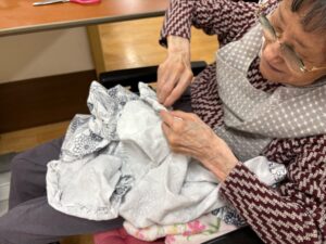 洗濯した包帯を巻きます。。近くには昔、看護職に従事されていた入居者様が、、
