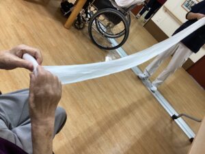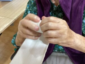 洗濯した包帯を巻きます。。近くには昔、看護職に従事されていた入居者様が、、