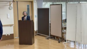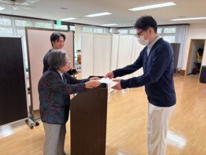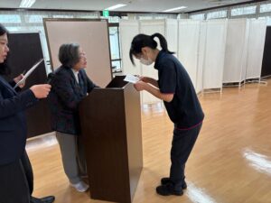 理事長から「困難なことが目の前にあった際には、一人で抱え込まずに、先輩職員へ相談、頼ってください。先輩職員は新人だったころを思い返しながら、指導・育成に務めてください。そして栄光の杜を明るくする存在になってもらいたい。そうすると入居者様も明るくHappyな生活を送ることができます」との言葉を伝えられました