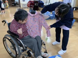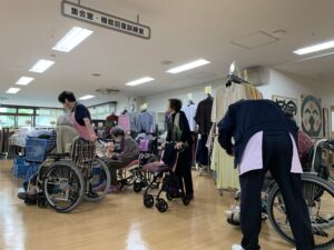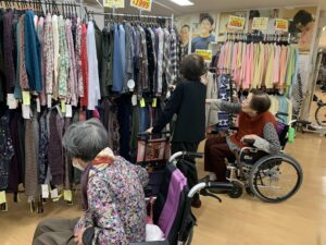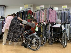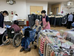 「久しぶりにお買い物できて楽しかった!」「こんなかわいい服があるなんて嬉しいね」と、入居者の皆さんの笑顔がとても印象的でした。普段とはまた違ったコミュニケーションのひとときにもなりました。